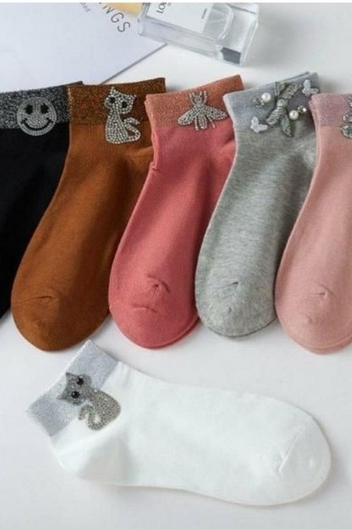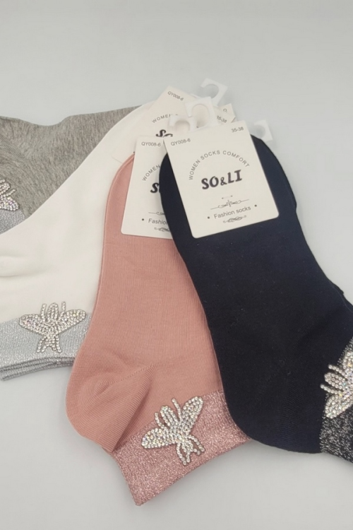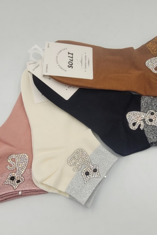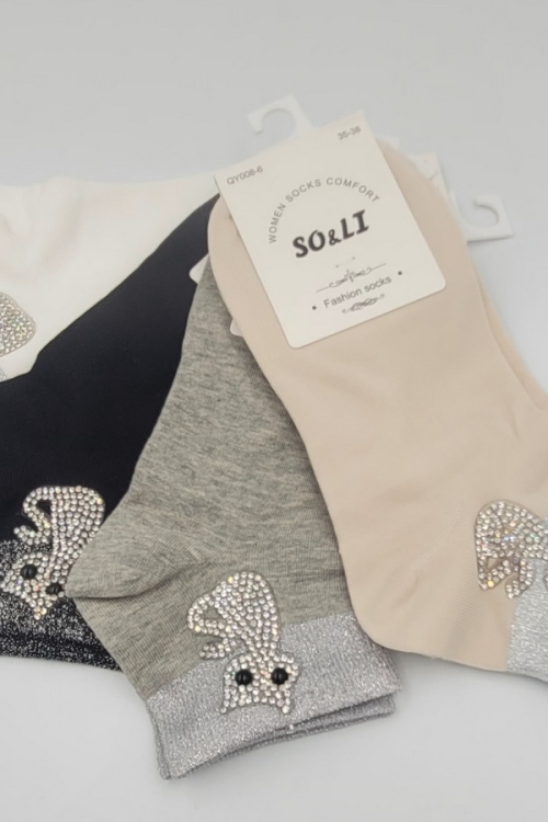 Bawełniane stopki damskie z biżuteryjnymi ozdobami przy ściągaczu. Pakowane po 4 pary/op, MIX kolorów i wzorów. UWAGA: prosimy o podanie ROZMIARU: 35-38 lub 38-41. WZORY WYBIERANE LOSOWO!